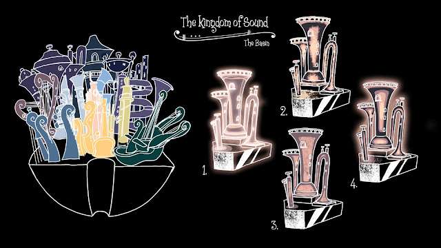 On the left was my first attempt at adding all the districts together on one small land. The four images are samples of the Tuba and Trombone district. Thumbnail 1 I applied a glow to only the white outlines. Thumbnail 4 I applied the glow to the colour fill of the Tuba. I personally prefer the artificial glow of 1 and the colour fill of 4.