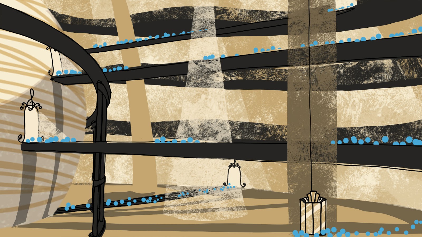 I've rather created the following to help me find some logic in the vast space that is the overture. The multilevelled space was difficult to picture when there was no clear-ish plan of what it may look like.Using my earlier Overture design, I've made a stab at a map (below) as a vague top-down guide toward major pathways, platforms and staircases. I've envisioned that perhaps the Overture is a cavernous half circle shape, like the orchestra footprint and run from there.